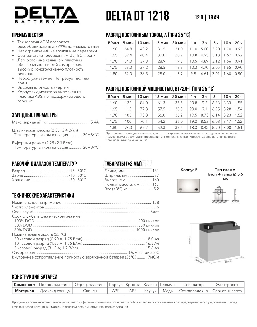 Габариты (мм) | 181x77x167 (длина, ширина, высота с клеммами) |
